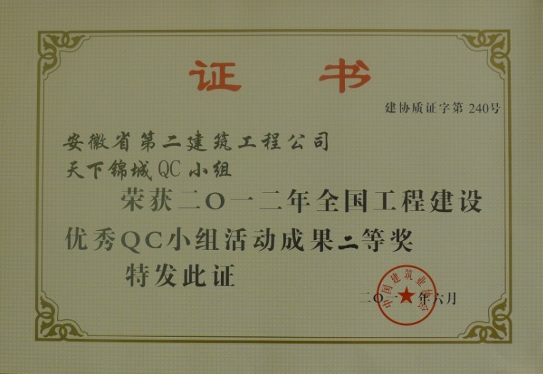 安徽二建公司喜获“2012年度天下工程建设优异QC小组运动效果”二等奖和省级一等奖