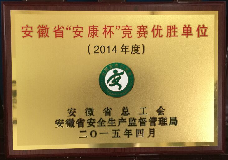 日前,在安徽省总工会和安徽省清静生产监视管理局组织开展的以“普遍发动提质量,文化引领强基础”为主题的“安康杯”竞赛运动评选中,我公司被授予2014年度安徽省“安康杯”竞赛先进单位庆幸称呼。