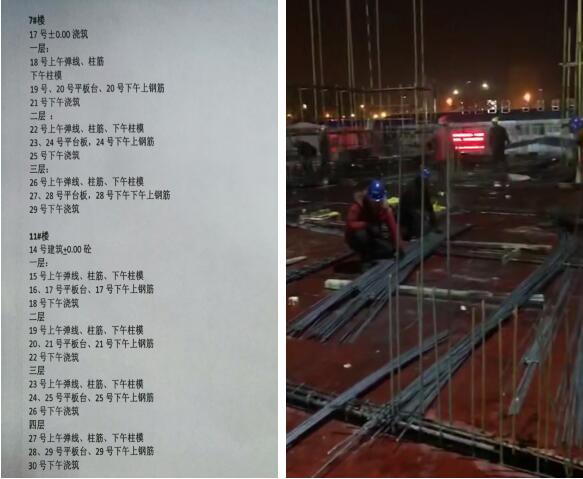 为完成春节前夕项目部7#号楼三层封顶、11#号楼四层封顶使命,二分公司向导班子高度重视,分公司生产副司理孟庆武扎根在一线监视指导。时间紧,使命重是项目部面临的严肃挑战,在难题眼前,项目全体职员没有退缩,制订了切实可行、精准高效的施工计划。一方面针对班组实验赏罚步伐,两班倒战略,对提前完成妄想使命的班组给与奖励,对完不可的班组给与处分。另一方面项目部全程跟踪、全心组织,昼夜奋战。在项目部全体员工的配合起劲下,四天完成一层结构,充分发挥了二建人攻坚克难的精神。