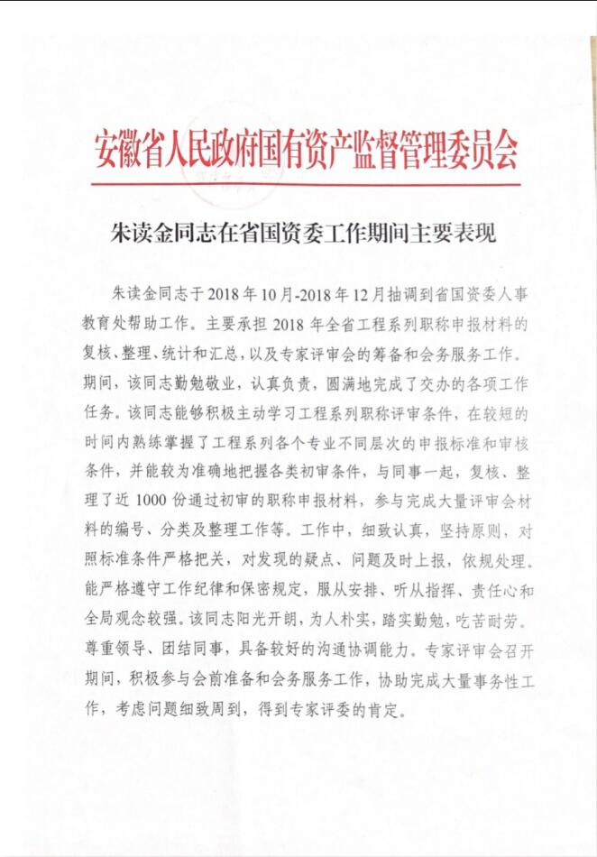2018年10月-2018年12月被抽调省国资委人事教育处帮事情,周末加班加点,兢兢业业,与国资委同事一审查近1000份职称申报质料,事情获得专家评委一致一定。