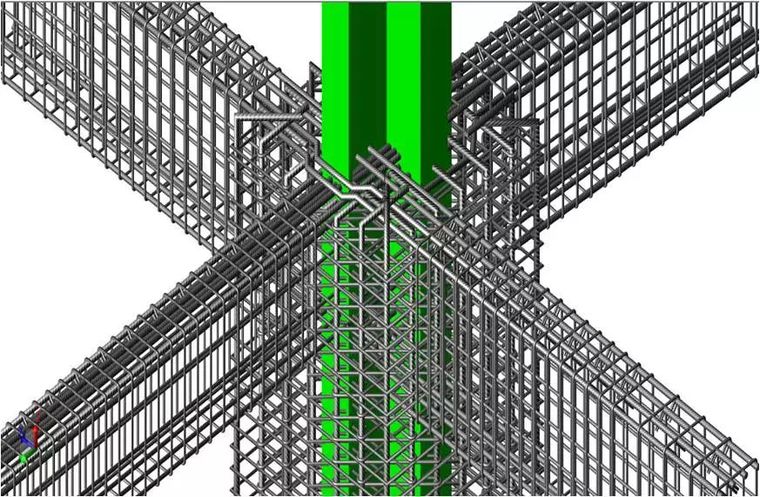 在重大节点的地方,钢筋的碰撞施展着主要的作用。在型钢混凝土梁柱节点处,钢筋数目众多,且由于型钢的保存,造成梁的纵向钢筋无法直接拉通。BIM工程师搭建节点模子,对钢筋的排布举行调解,通过绕弯、预留洞口、焊接等方法,阻止钢筋与型钢的碰撞。