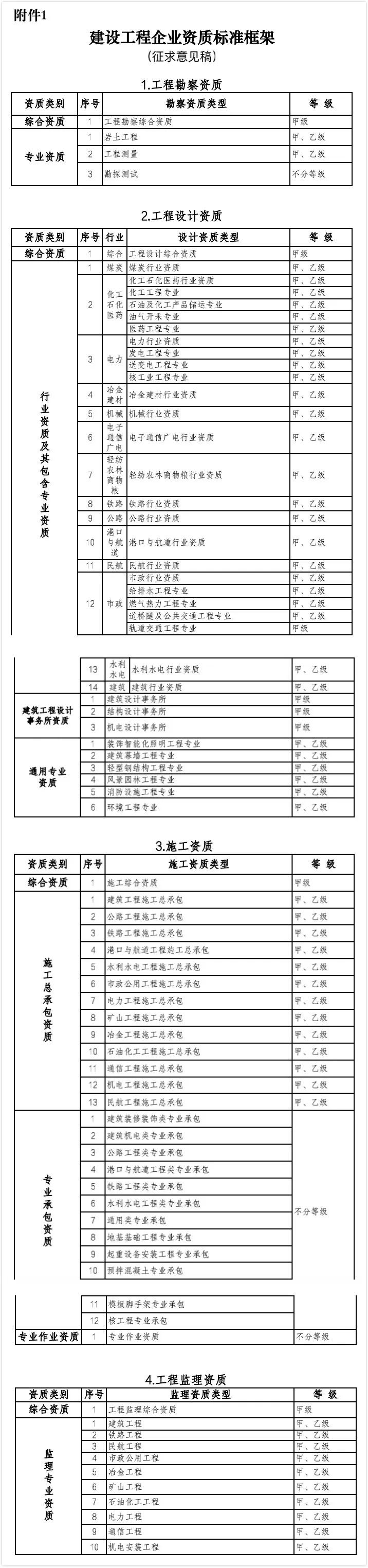 《建设工程企业资质标准框架(征求意见稿)》全文如下: