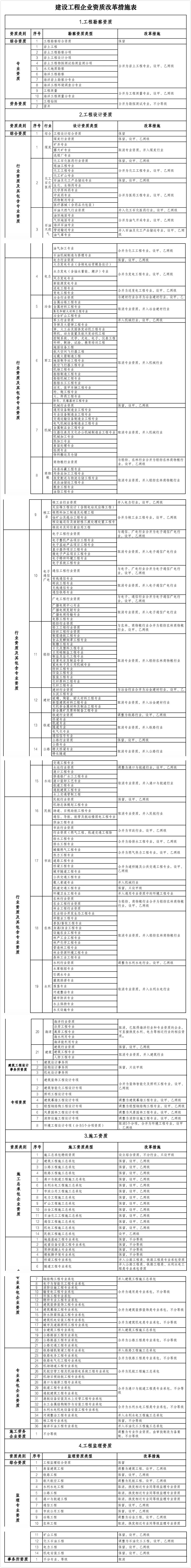 (二)工程设计资质。保存综合资质。对部分行业资质举行整合,其中,冶金行业与建材行业合并为冶金建材行业资质,轻纺行业、农林行业、商物粮行业合并为轻纺农林商物粮行业,电子行业、通讯行业、广电行业合并为电子通讯广电行业,石油自然气行业并入化工石化医药行业,军工行业并入机械行业,核工业行业并入电力行业,资质品级压减为甲、乙两级,原丙级资质并入响应行业乙级资质。作废海洋行业及专业资质,相关企业可以换发相近行业资质。整合原化工石化医药、石油自然气、电力、市政行业中的专业资质,资质品级压减为甲、乙两级,原丙级资质并入响应专业乙级资质;作废其他行业的专业资质,并入响应行业资质,原甲、乙级专业资质并入响应品级的行业资质,原丙级专业资质并入乙级行业资质。将专项资质调解为通用专业资质,作废情形工程专项资质的5个专项种别,整合为情形工程专业资质,资质品级压减为甲、乙两级,原丙级资质并入响应专业乙级资质。保存3类事务所资质。