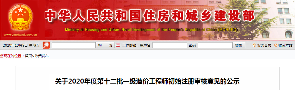 克日,住房和城乡建设部公示了2020年度第十二批一级造价工程师初始注册的审核意见。