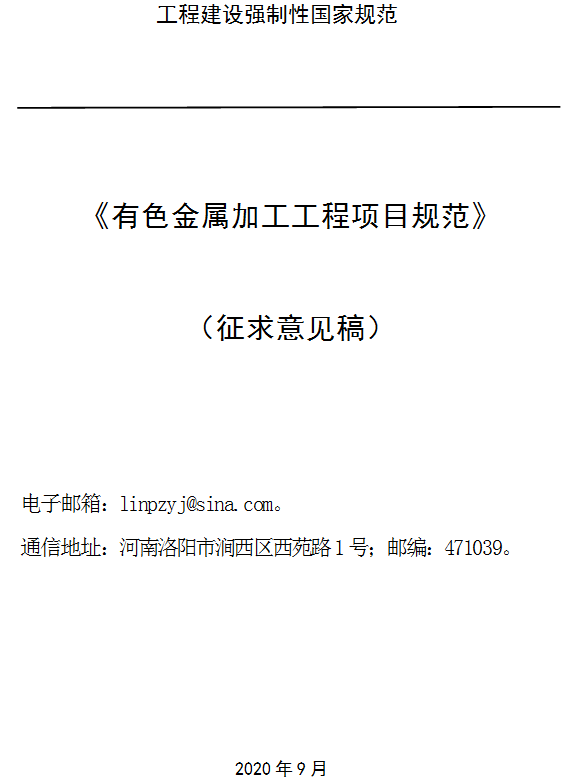 ¡¶ÓÐÉ«½ðÊô¼Ó¹¤¹¤³ÌÏîÄ¿¹æ·¶£¨Õ÷ÇóÒâ¼û¸å£©¡·